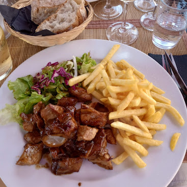 Go at lunchtime for the good value ‘menu de jour’ from ���18 for 3 courses. It’s a restaurant and bar so you can drop in for a beer or glass of wine in the lovely shaded courtyard sitting area out front if you happen to be passing.
